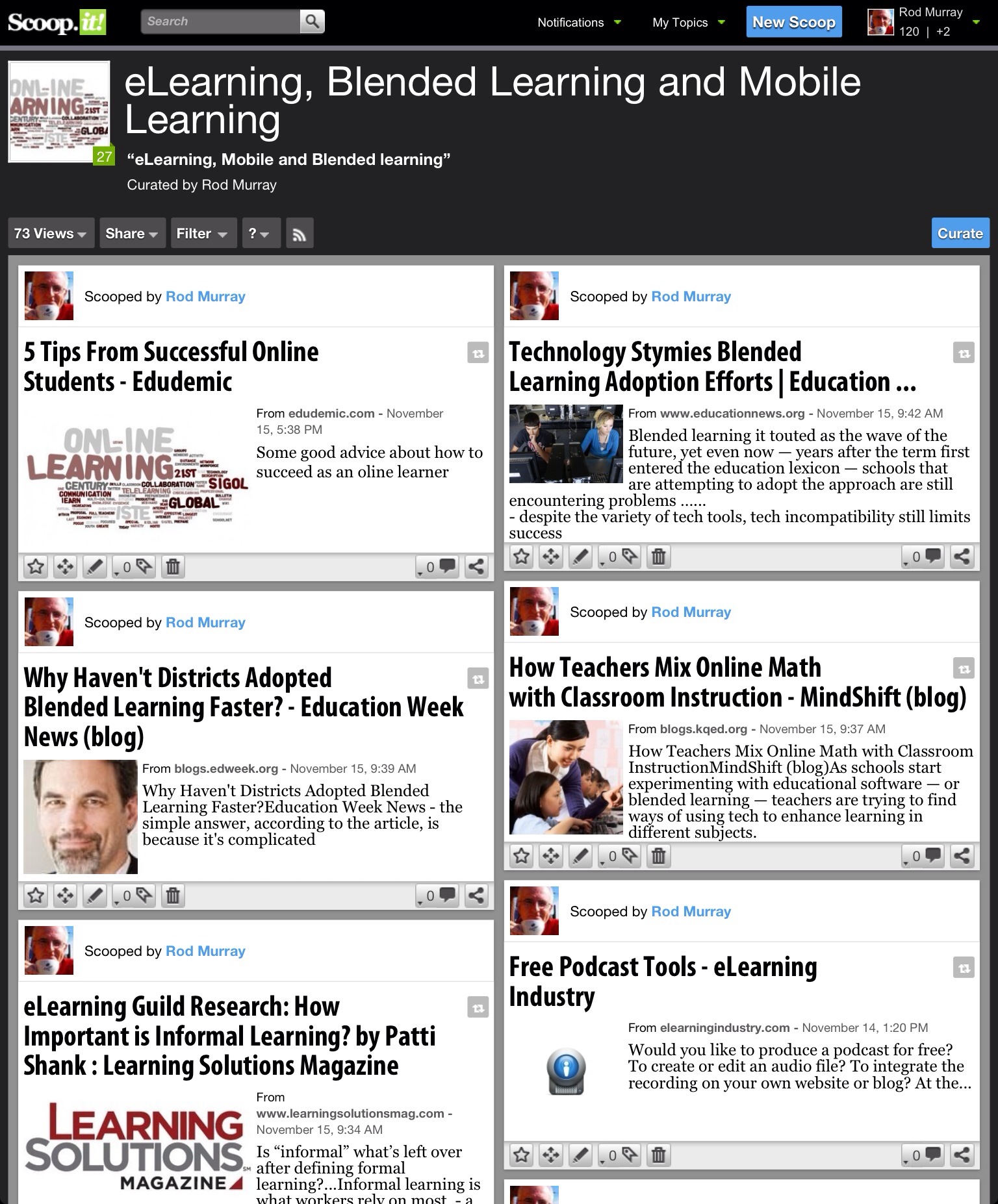 I hear a lot about Content Curation in the Twitterverse and so I thought I’d play around with it for a while. Over the last month or so I’ve been working on editing an eLearning course, so I decided I would try one of the newer curators- Scoop.It!