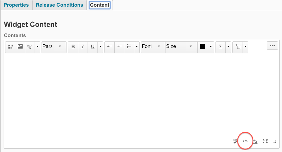 6) Once you’ve named your Widget, click on the Content Tab and then click on the HTML symbol at the bottom right of the editing window, as indicated by the red oval. This is where you will paste some HTML code from Twitter. Rest assured that you will not need to know anything about HTML to do this!