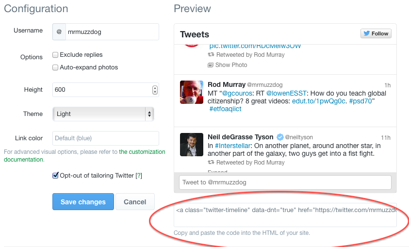 9) Now copy the HTML code from the window near the bottom, as shown in the red oval below, after checking to see that the Tweets you expect to be in the feed show in the Preview.