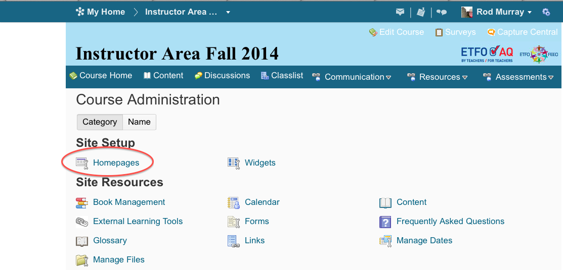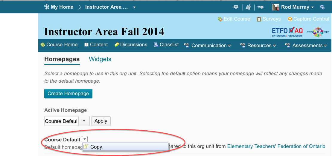 3) If you do not see a Homepage called Course Default Copy, click on the drop down menu next to Course Default and make a copy of your course so that you can make changes and not affect the Course Default. Always work with the Course Default Copy and make sure it’s the Active homepage. There is an Active Homepage drop down menu that chooses the Active page. Make sure your Copy is Active!