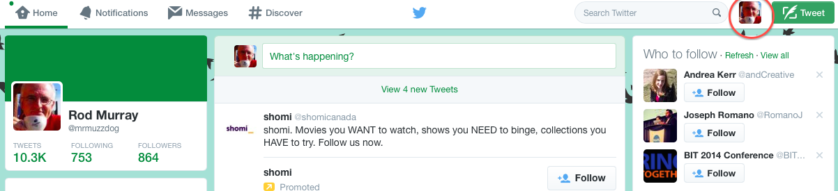 7) Now jump over to Twitter in another Browser tab and sign into Twitter with your email and password, leaving the D2L Content tab open as you will be pasting code into the Editing Window there. Click on your Twitter photo or icon at the top right of your Twitter homepage as indicated by the red oval below, to access your Settings and Twitter widgets. Click on Settings in the drop down menu.