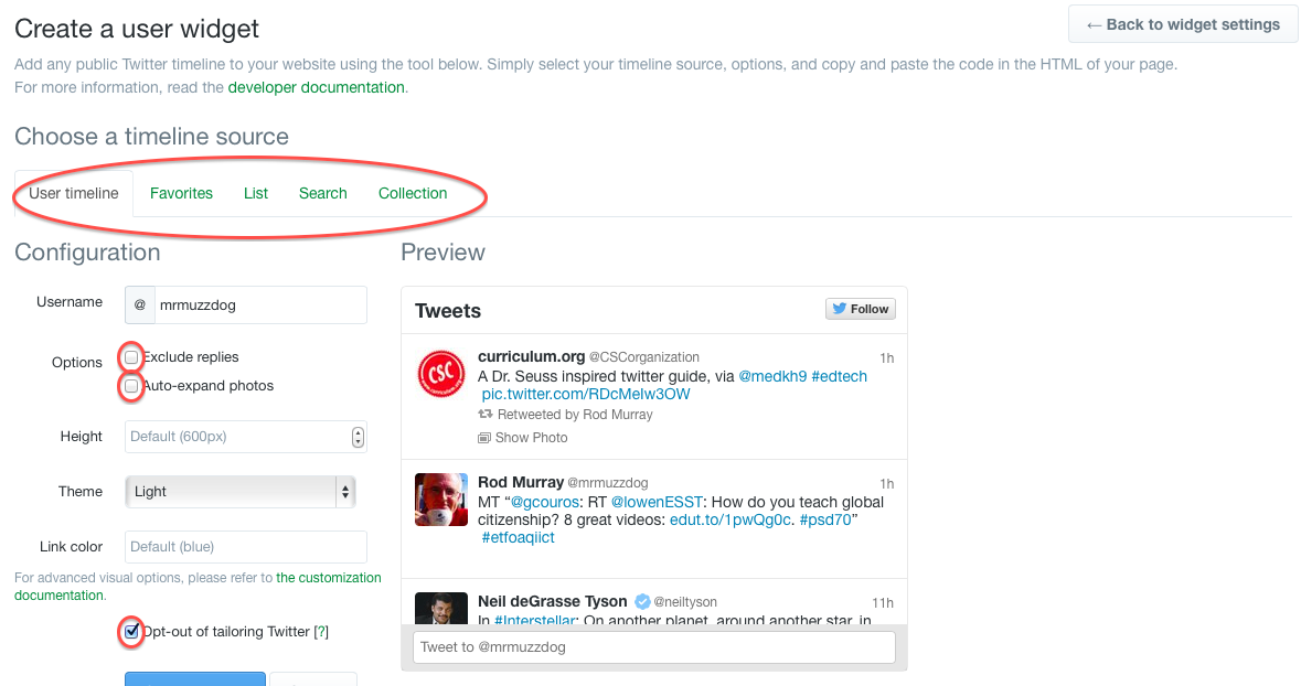 8) Next, in the list at the left, click on Widgets and then click Create New Widget. Once you’ve decided which type of Twitter Widget you wish to create, click the corresponding tab: User Timeline (e.g. @mrmmuzzdog, @etfoaq, @yourname, etc), Favourites (all the tweets you have added to your Favourite list), List (Twitter can create a single feed from a list of users), a Search (e.g. any #hashtag, #etfoaqiict, #mathchat) or Collection. You will, in all likelihood, be creating a User Timeline (a personal feed) or a #hashtag search feed for your course homepage.