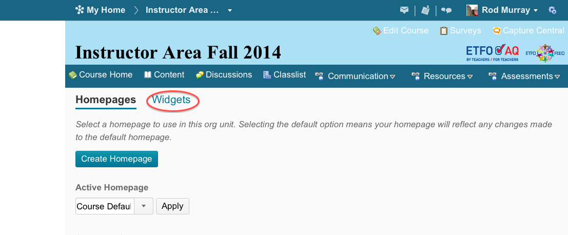 11) If you have already created a Twitter Widget in D2L for a previous course (e.g. a #etfoaqiict Search widget and only need to add it to your current course, then you will only need to do the latter part of Step #10, by dragging an existing widget to the Active Homepage, in an appropriate location.